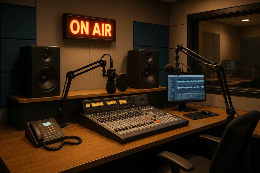 Key components: large-diaphragm and shotgun microphones, voice processors, audio interfaces/recorders, DAW workstations, playout & automation systems, music scheduling, newsroom computer systems (NRCS), ingest and logging, talkback/intercom, acoustic treatment (panels, bass traps, diffusers).